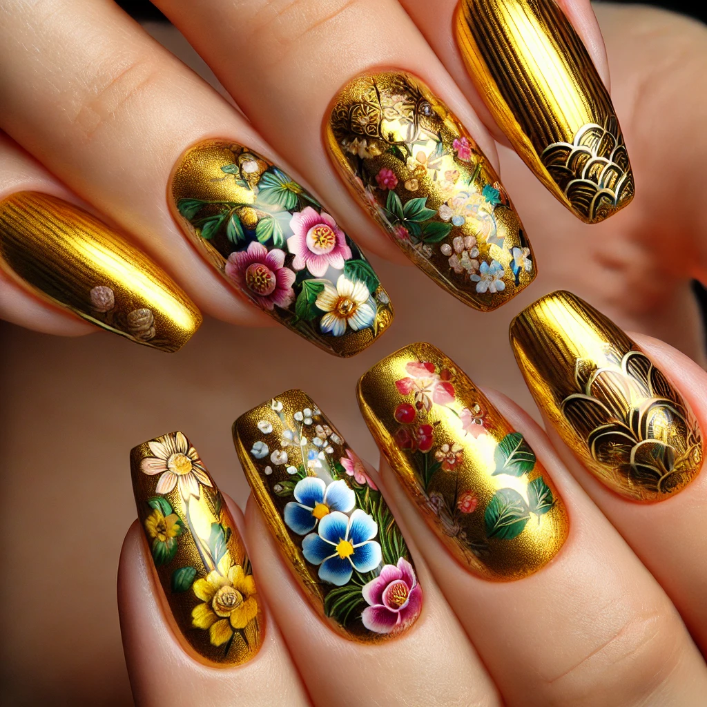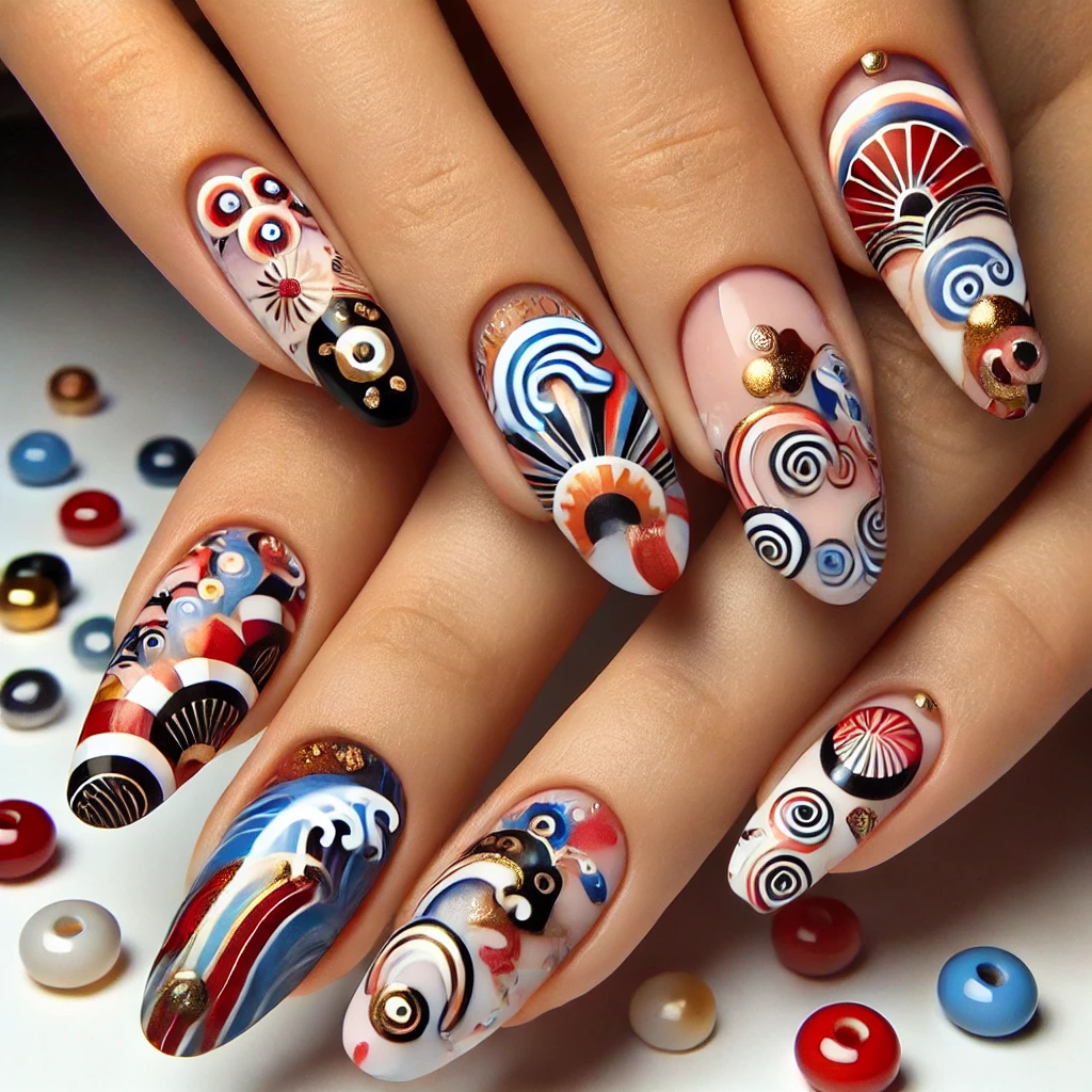 ベースカラーには深みのあるレッドとブルーを使って、そこにゴールドのラインをアクセントに入れることで、上品さもプラス💎✨波模様や点描風のカラフルな豆で遊び心をプラスして、シンプルすぎないデザインに仕上げたよ🎨