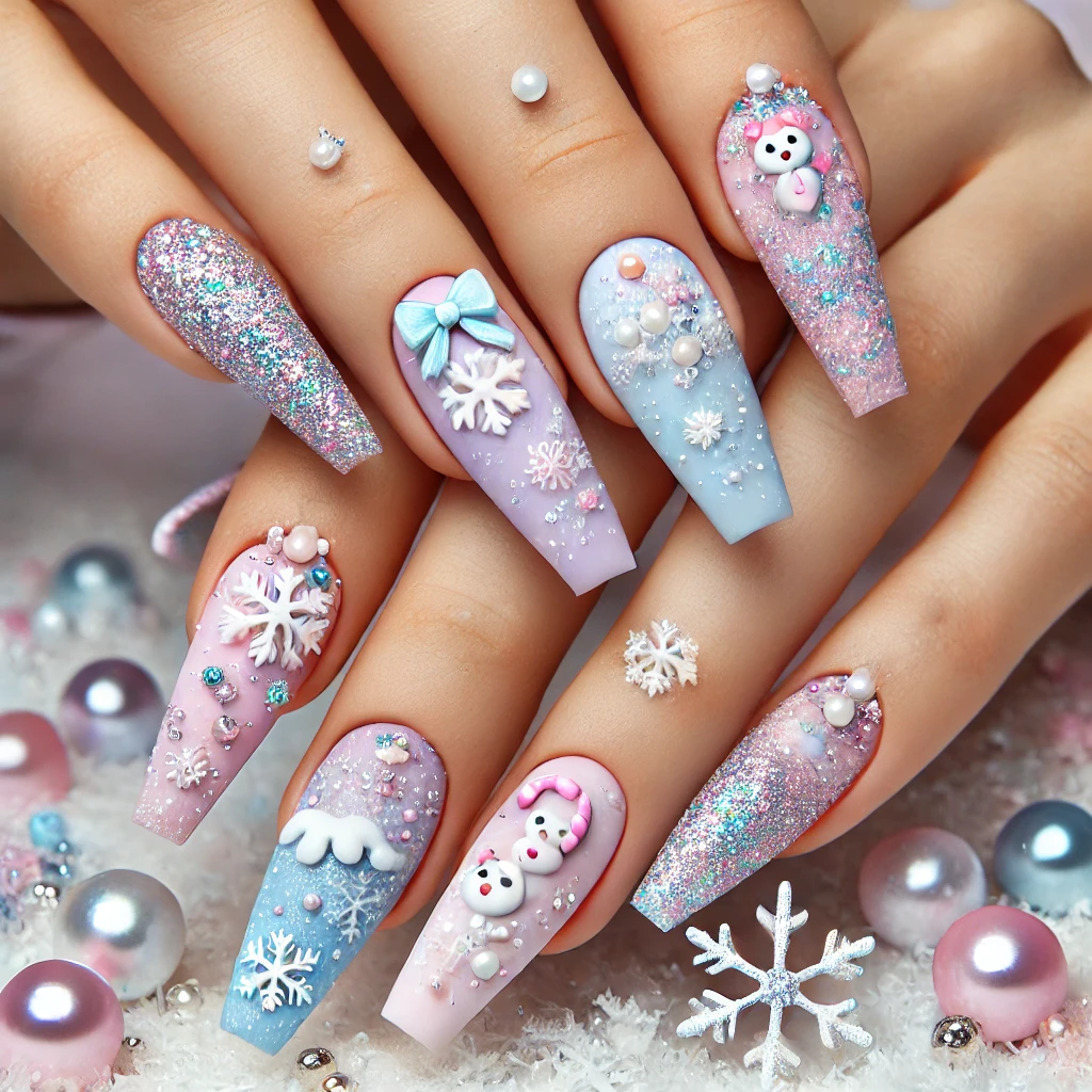 さらに、小さいパールを散らして雪っぽい雰囲気を出してるよ⛄💖 これだけでも可愛いんだけど、ストーンをプラスしてゴージャス感アップ💅✨ 手を動かすたびにキラキラして、まじでプリンセス気分👑💙✨