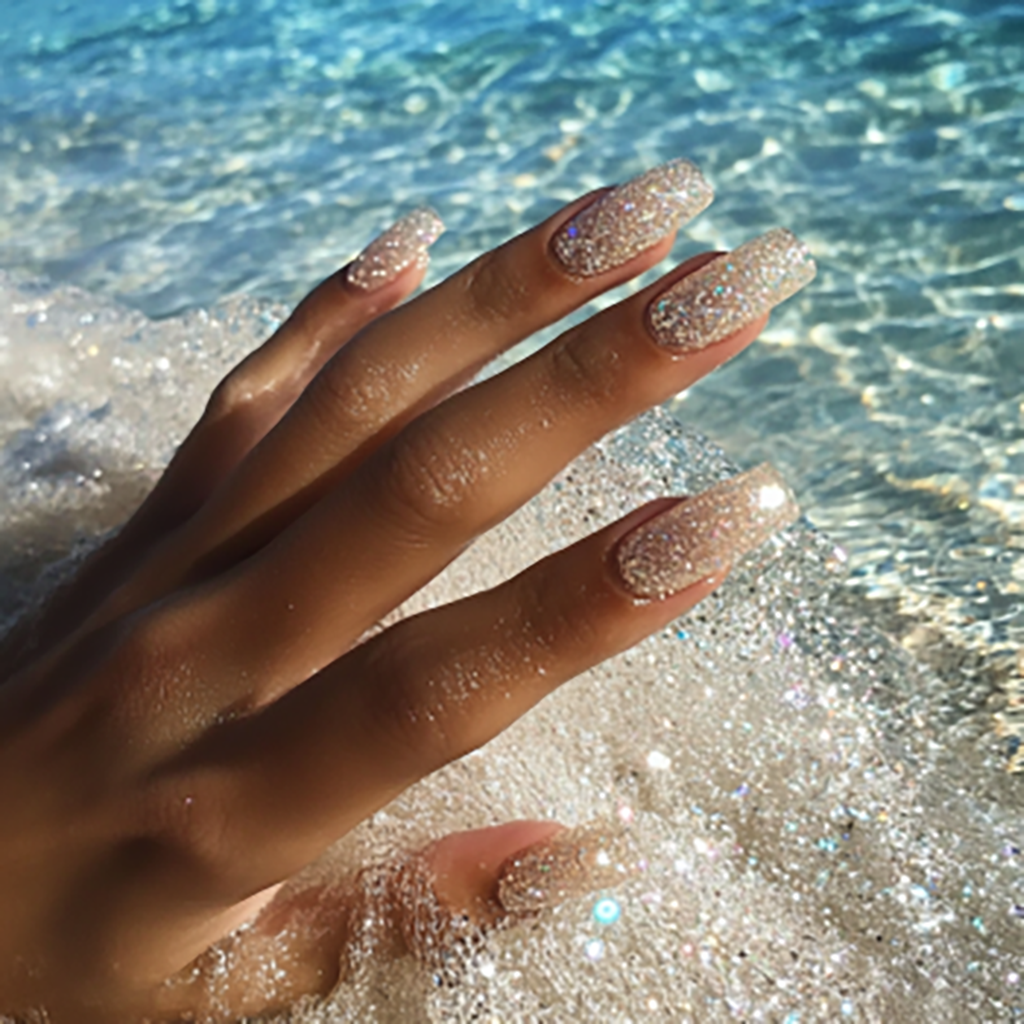 このネイルは、ラメがたっぷり使われていて、まるで砂がキラキラ輝いているみたいに見えるの✨💎✨ 透明感のあるジェルをベースにして、ラメをふんだんに散りばめてるから、光に当たると本当に美しいんだ〜💅✨✨