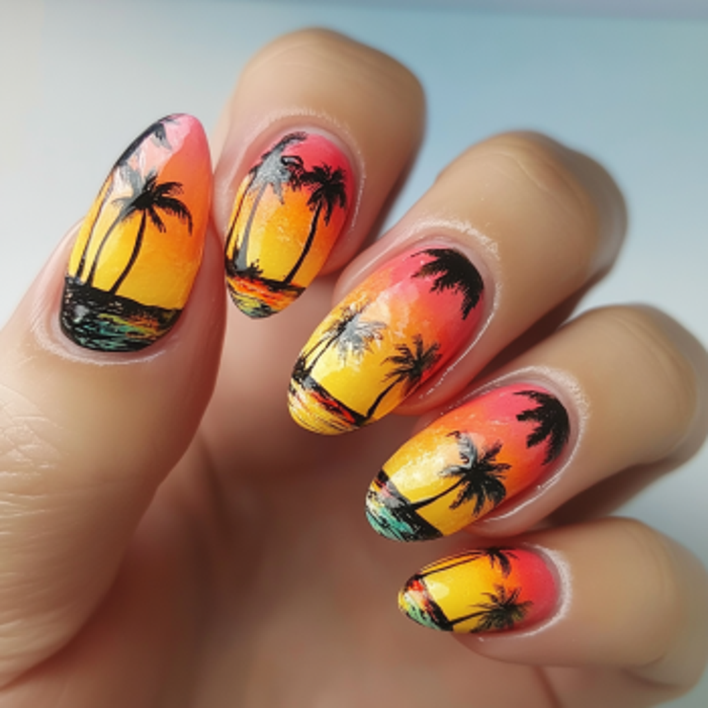 このネイル、南国のサンセット🌅とヤシの木🌴をイメージして、オレンジとピンクのグラデーションに黒いシルエットを重ねたんだ🌟