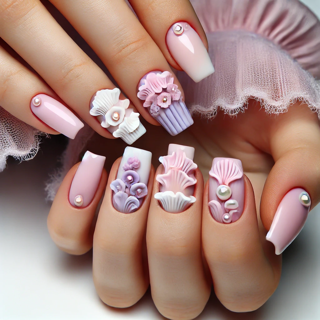 そこに立体感のあるフリル模様をプラスして、指先をまるでドレスみたいに仕上げたよ👗✨ パールや細かいグリッターもアクセントに入れて、ちょっぴりリッチな雰囲気も演出🎀