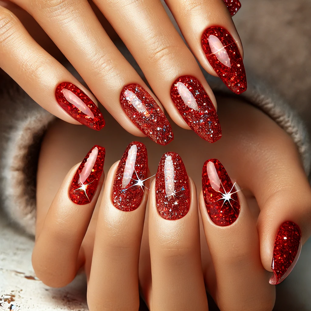 赤って派手すぎると感じることもあるけど、このネイルはグリッターの輝きが加わることで、目立ちながらも上品で華やかな仕上がりになっているの✨