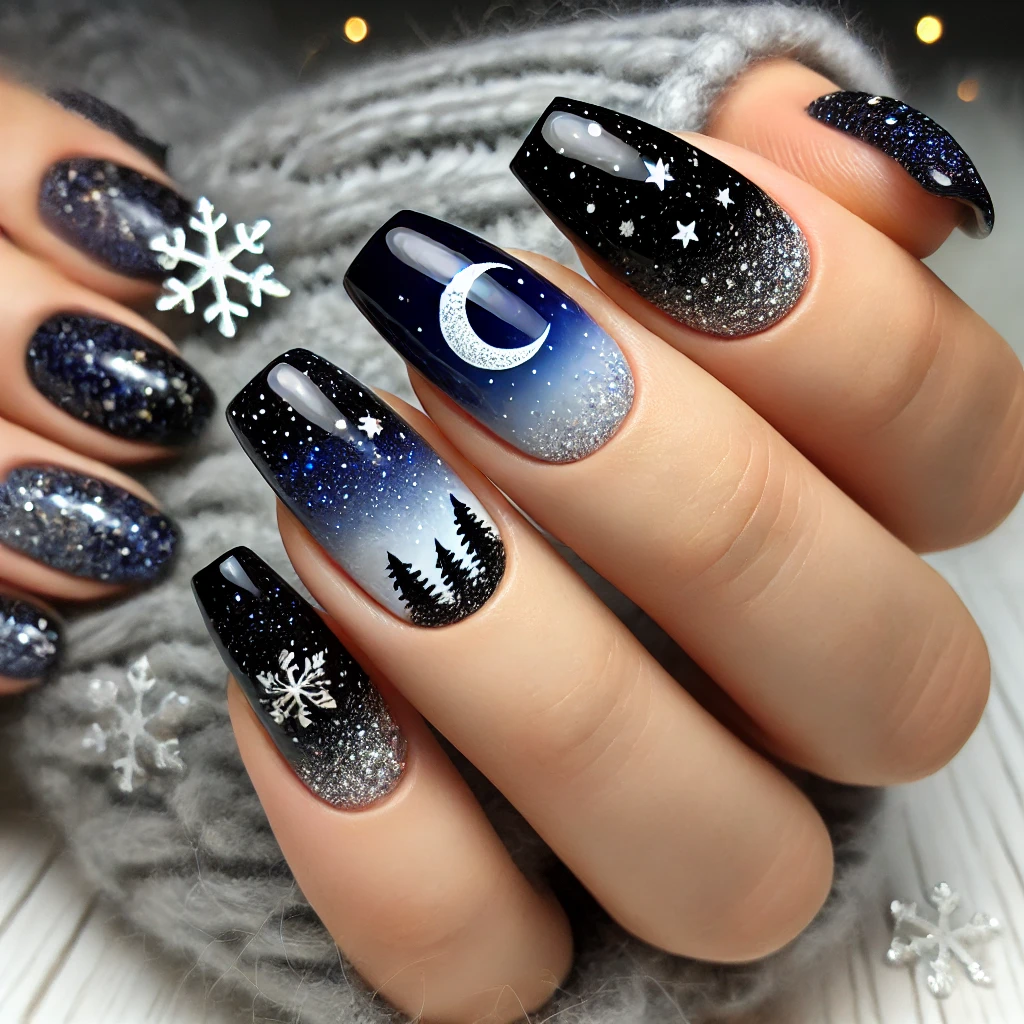 このデザイン、めっちゃ雰囲気あるよね💅❕中指には大きめの三日月🌙を描いて存在感を出しつつ、他の指には細かい星⭐や雪の結晶❄️を散りばめて、きらめく夜空をイメージしたよ✨💎さらにラメを足して星たちが瞬いてる感じをプラス🎶